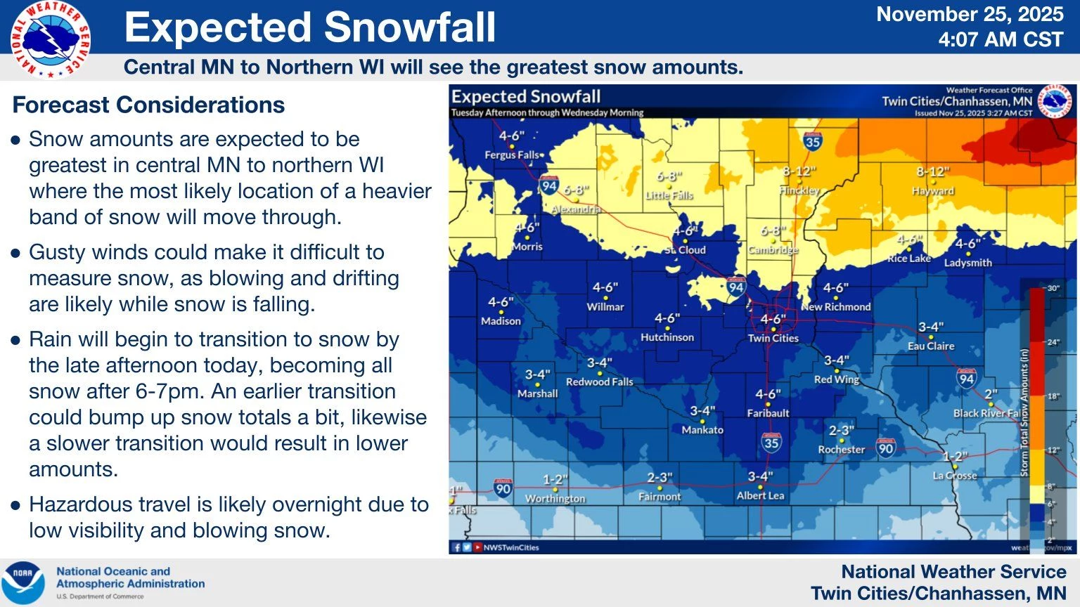 Tuesday morning’s forecast calls 6-8 inches of snow across most of central Minnesota, with 8-12 inches possible further north and east.